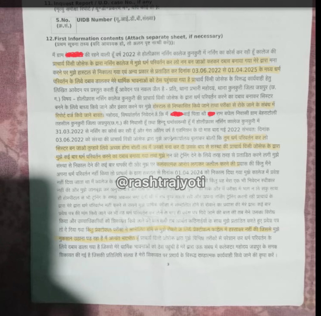In the FIR, which Rashtra Jyoti has accessed, Sushmita stated that she resides in Behratoli town and enrolled in the General Nursing and Midwifery course at Holy Cross Nursing College in March 2022. There, Principal Bincy Joseph, a nun, repeatedly pressured her to change her religion to Christianity. Upon refusing, she was evicted from the hostel. Between June 2022 and April 2025, she was consistently coerced to convert and become a nun, and her religious feelings were repeatedly hurt.