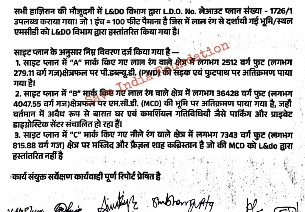 The survey, conducted in the second week of October by officials from the Municipal Corporation of Delhi (MCD), Land & Development Office (L&DO), Delhi Development Authority (DDA), was ordered following a series of complaints by Save India Foundation, led by well-known civic activist Preet Sirohi.